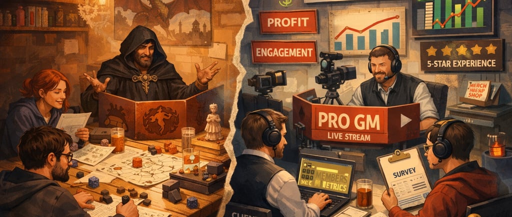 There is a subtle shifts in the language used. Groups discuss value for money, deliverables, content cadence, audience growth. None of this appears oppressive, but it reorients the purpose of play. Instead of asking what kind of story a group wants to tell, the framing can become what kind of experience can be reliably delivered.