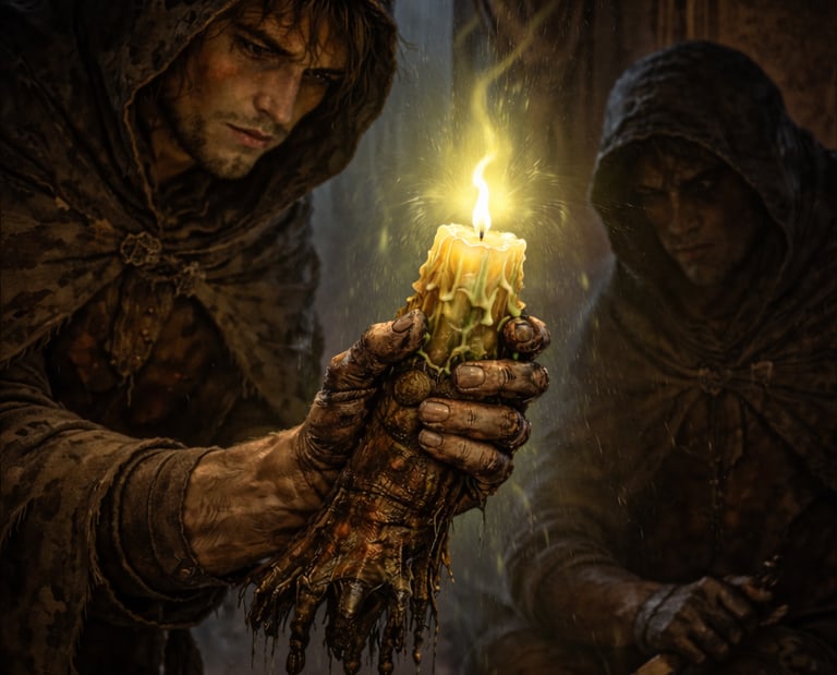 Darrik carries something he should never have made – a charm fashioned from a severed hand, its eerie candle said to open any lock and still any witness who looks upon its light.